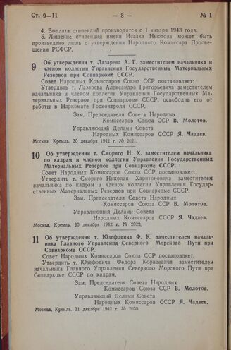 Постановление Совета Народных Комиссаров Союза ССР. Об утверждения т. Смориго Н.X. заместителем начальника по кадрам и членом коллегии Управления Государственных Материальных Резервов при Совнаркоме СССР. 30 декабря 1942 г. № 2022