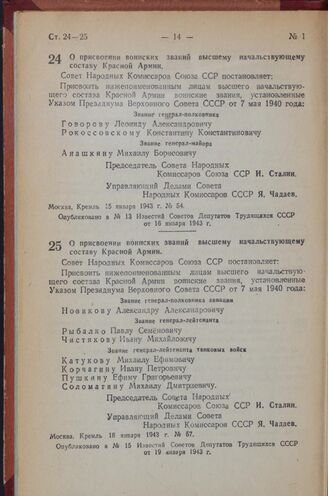Постановление Совета Народных Комиссаров Союза ССР. О присвоении воинских званий высшему начальствующему составу Красной Армии. 15 января 1943 г. № 54