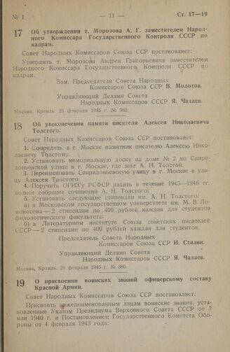 Постановление Совета Народных Комиссаров Союза ССР. О присвоении воинских званий офицерскому составу Красной Армии. 2 марта 1945 г. № 391 // Опубликовано в № 52 Известий Советов Депутатов Трудящихся СССР от 3 марта 1945 г.