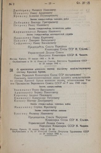 Постановление Совета Народных Комиссаров Союза ССР. О присвоении воинских званий высшему начальствующему составу Красной Армии. 23 января 1943 г. № 85