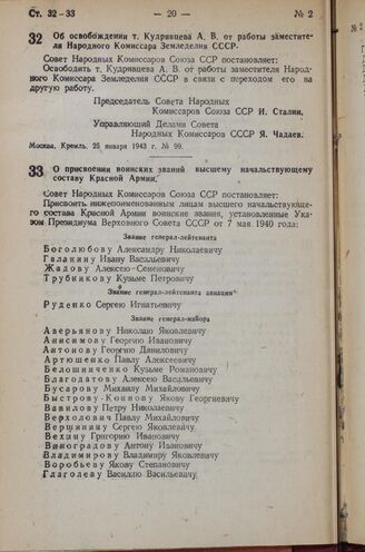 Постановление Совета Народных Комиссаров Союза ССР. О присвоении воинских званий высшему начальствующему составу Красной Армии. 27 января 1943 г. № 107