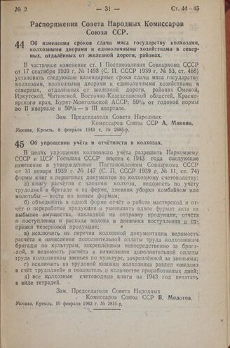Распоряжение Совета Народных Комиссаров Союза ССР. Об упрощении учета и отчетности в колхозах. 10 февраля 1943 г. № 2815-р