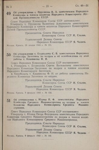 Постановление Совета Народных Комиссаров Союза ССР. Об утверждении т. Юдина П.Ф. заместителем Народного Комиссара Среднего Машиностроения по кадрам и членом коллегии Народного Комиссариата Среднего Машиностроения. 9 февраля 1943 г. № 142