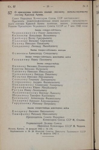 Постановление Совета Народных Комиссаров Союза ССР. О присвоении воинских званий высшему начальствующему составу Красной Армии. 14 февраля 1943 г. № 176
