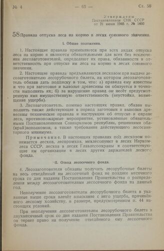 Постановление Совета Народных Комиссаров Союза ССР. Правила отпуска леса на корню в лесах союзного значения. Утверждены Постановлением СНК СССР от 21 июня 1945 г. № 1460