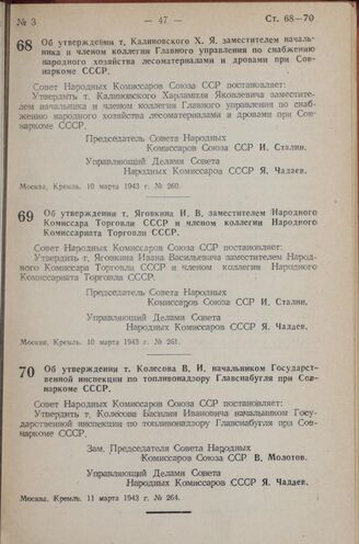 Постановление Совета Народных Комиссаров Союза ССР. Об утверждении т. Колесова В.И. начальником Государственной инспекции по топливонадзору Главснабугля при Совнаркоме СССР. 11 марта 1943 г. № 264