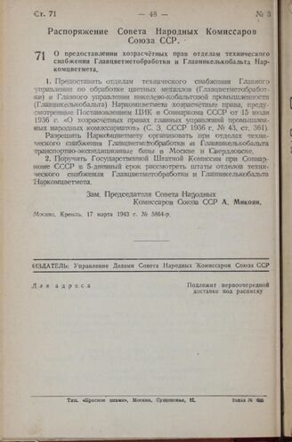 Распоряжение Совета Народных Комиссаров Союза ССР. О предоставлении хозрасчетных прав отделам технического снабжения Главцветметобработки и Главникелькобальта Наркомцветмета. 17 марта 1943 г. № 5864-р
