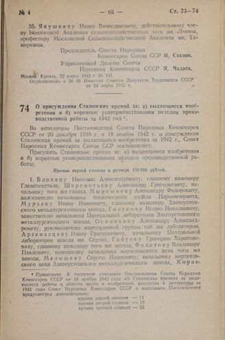 Постановление Совета Народных Комиссаров Союза ССР. О присуждения Сталинских премий за: а) выдающиеся изобретения и б) коренные усовершенствования методов производственной работы за 1942 год. 22 марта 1943 г. № 342