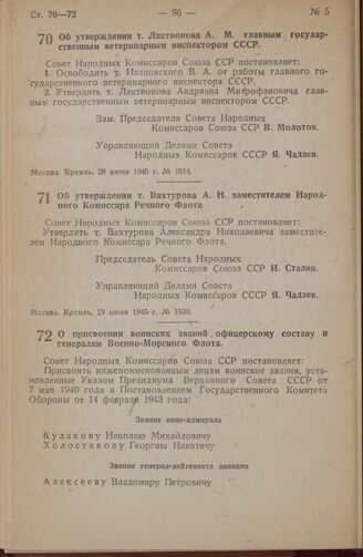 Постановление Совета Народных Комиссаров Союза ССР. Об утверждении т. Лактионова А. М. главным государственным ветеринарным инспектором СССР. 28 июня 1945 г. № 1514