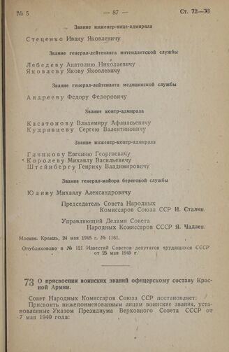 Постановление Совета Народных Комиссаров Союза ССР. О присвоения воинских званий офицерскому составу Красной Армии. 8 июня 1945 г. № 1333 // Опубликовано в № 134 Известий Советов депутатов трудящихся СССР от 9 июня 1945 г.