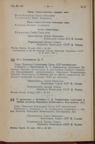 Постановление Совета Народных Комиссаров Союза ССР. О т. Десятникове Д.Т. 20 марта 1943 г. № 313