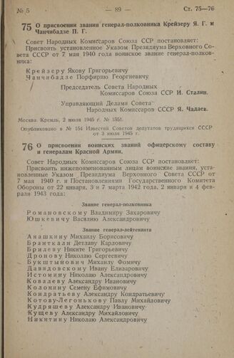 Постановление Совета Народных Комиссаров Союза ССР. О присвоении воинских званий офицерскому составу и генералам Красной Армии. 11 июля 1945 г. № 1683 // Опубликовано в № 162 Известий Советов депутатов трудящихся СССР от 12 июля 1945 г.