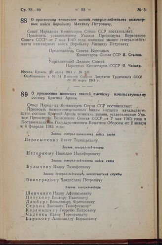 Постановление Совета Народных Комиссаров Союза ССР. О присвоении воинских званий высшему начальствующему составу Красной Армии. 31 марта 1943 г. № 343 // Опубликовано в № 76 Известий Советов Депутатов Трудящихся СССР от 1 апреля 1943 г.