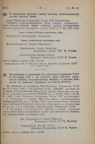 Постановление Совета Народных Комиссаров Союза ССР. О присвоении воинских званий высшему начальствующему составу Красной Армии. 1 апреля 1943 г. № 345