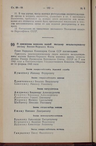 Постановление Совета Народных Комиссаров Союза ССР. О присвоении воинских званий высшему начальствующему составу Военно-Морского Флота. 18 апреля 1943 г. № 412