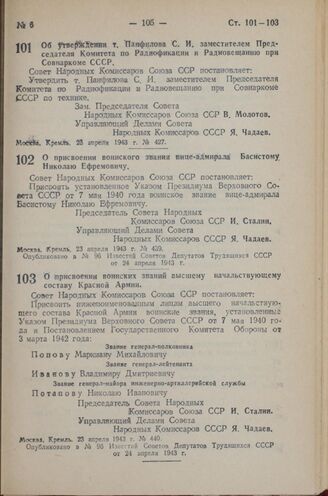 Известия Советов Депутатов Трудящихся СССР от 24 апреля 1943 г., № 96.