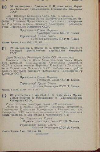 Постановление Совета Народных Комиссаров Союза ССР. Об утверждении т. Дикермана Н.И. заместителем Народного Комиссара Промышленности Строительных Материалов СССР. 3 мая 1943 г. № 476