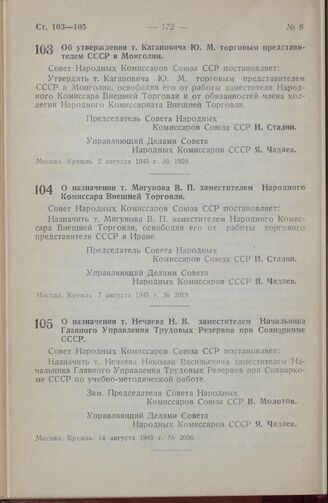 Постановление Совета Народных Комиссаров Союза ССР. О назначении т. Мигунова В. П. заместителем Народного Комиссара Внешней Торговли. 7 августа 1945 г. № 2019
