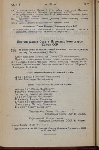 Постановление Совета Народных Комиссаров Союза ССР. О присвоении воинских званий высшему начальствующему составу Военно-Морского Флота. 12 мая 1943 г. № 517