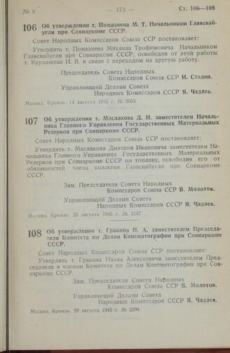 Постановление Совета Народных Комиссаров Союза ССР. Об утверждении т. Граrина И. А. заместителем Председателя Комитета по Делам Кинематографии при Совнаркоме СССР. 29 августа 1945 г. № 2204