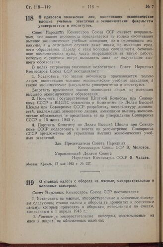 Постановление Совета Народных Комиссаров Союза ССР. О ставках налога с оборота на мясные, мясорастительные и молочные консервы. 15 мая 1943 г. № 531