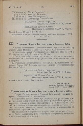 Постановление Совета Народных Комиссаров Союза ССР. О выпуске Второго Государственного Военного Займа. 4 июня 1943 г. № 626