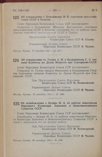 Постановление Совета Народных Комиссаров Союза ССР. Об утверждении тт. Гусева А. И. и Калашникова Г. С. членами Комитета по Делам Искусств при Совнаркоме СССР. 15 сентября 1945 г. № 2380
