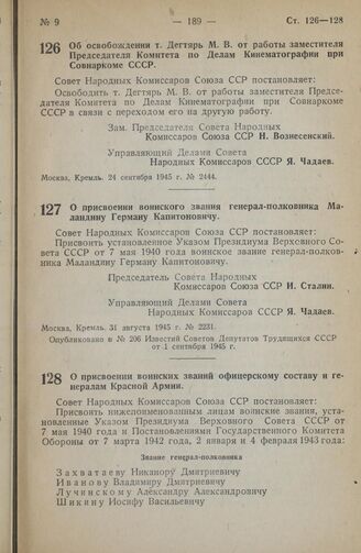 Постановление Совета Народных Комиссаров Союза ССР. Об освобождении т. Дегтярь М. В. от работы заместителя Председателя Комитета по Делам Кинематографии при Совнаркоме СССР. 24 сентября 1945 г. № 2444