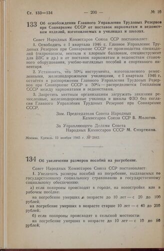 Постановление Совета Народных Комиссаров Союза ССР. Об увеличении размеров пособий на погребение. 15 ноября 1945 г. № 2903