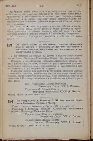 Постановление Совета Народных Комиссаров Союза ССР. Об утверждении т. Белахова Л.Ю. заместителем Народного Комиссара Морcrого Флота. 21 июня 1943 г. № 683
