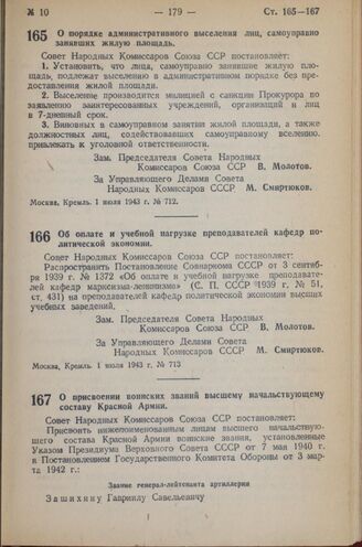 Постановление Совета Народных Комиссаров Союза ССР. О порядке административного выселения лиц, самоуправно занявших жилую площадь. 1 июля 1943 г. № 712
