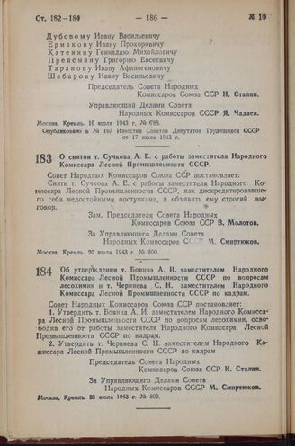 Постановление Совета Народных Комиссаров Союза ССР. Об утверждении т. Бовина А.И. заместителем Народного Комиссара Лесной Промышленности СССР по вопросам лесохимии и т. Черняева С.Н. заместителем Народного Комиссара Лесной Промышленности СССР по кадрам. 23 июля 1943 г. № 809