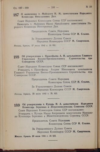 Постановление Совета Народных Комиссаров Союза ССР. О назначении т. Майского И.М. заместителем Народного Комиссара Иностранных Дел. 27 июля 1943 г. № 831