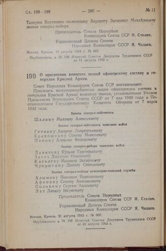 Известия Советов Депутатов Трудящихся СССР от 22 августа 1943 г., № 198.