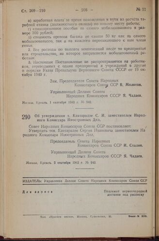 Постановление Совета Народных Комиссаров Союза ССР. Об утверждении т. Кавтарадзе С.И. заместителем Народного Комиссара Иностранных Дел. 2 сентября 1943 г. № 943