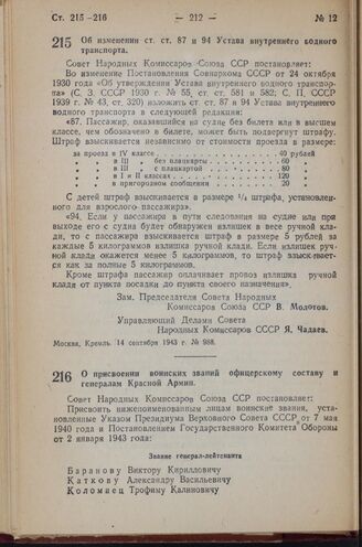 Постановление Совета Народных Комиссаров Союза ССР. Об изменении ст. ст. 87 и 94 Устава внутреннего водного транспорта. 14 сентября 1943 г. № 988