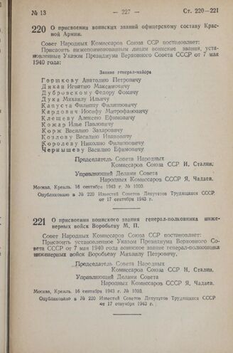 Известия Советов Депутатов Трудящихся СССР от 17 сентября 1943 г., № 220.