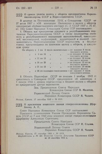 Известия Советов Депутатов Трудящихся СССР от 18 сентября 1943 г., № 221.