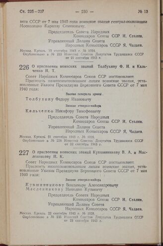 Постановление Совета Народных Комиссаров Союза ССР. О присвоении воинских званий Толбухину Ф.И. и Кальченко Н.Т. 21 сентября 1943 г. № 1026