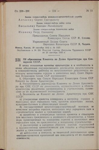 Постановление Совета Народных Комиссаров Союза ССР. Об образовании Комитета по Делам Архитектуры при Совнаркоме СССР. 29 сентября 1943 г. № 1064
