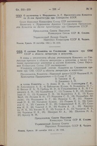 Постановление Совета Народных Комиссаров Союза ССР. О составе Комитета по Сталинским премиям при СНК СССР в области литературы и искусства. 29 сентября 1943 г. № 1066