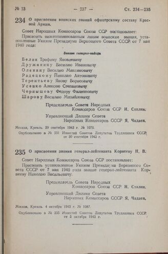 Постановление Совета Народных Комиссаров Союза ССР. О присвоении воинских званий офицерскому составу Красной Армии. 29 сентября 1943 г. № 1070 // Опубликовано в № 231 Известий Советов Депутатов Трудящихся СССР от 30 сентября 1943 г.