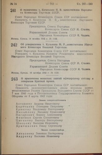 Постановление Совета Народных Комиссаров Союза ССР. О назначении т. Кочеткова П.В. заместителем Народного Комиссара Торговли СССР. 14 октября 1943 г. № 1159
