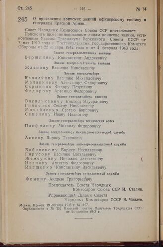 Постановление Совета Народных Комиссаров Союза ССР. О присвоении воинских званий офицерскому составу и генералам Красной Армии. 23 октября 1943 г. № 1167