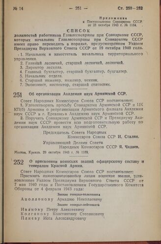 Постановление Совета Народных Комиссаров Союза ССР. Об организация Академии наук Армянской ССР. 29 октября 1943 г. № 1189