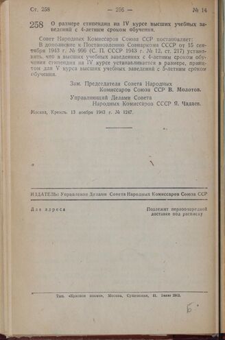 Постановление Совета Народных Комиссаров Союза ССР. О размере стипендии на IV курсе высших учебных заведений с 4-летним сроком обучения. 13 ноября 1943 г. № 1247