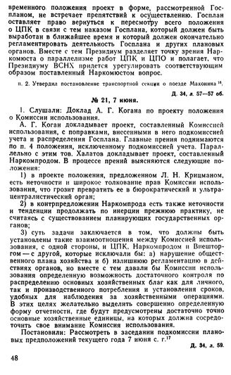 Протокол Президиума Госплана № 21, 7 июня 1921 г.