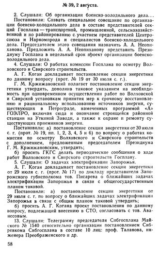 Протокол Президиума Госплана № 39, 2 августа 1921 г.