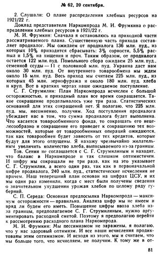 Протокол Президиума Госплана № 62, 20 сентября 1921 г.