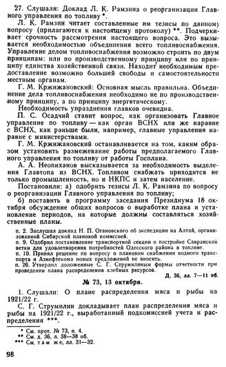 Протокол Президиума Госплана № 73, 13 октября 1921 г. // Д. 36, лл. 25—29 об.